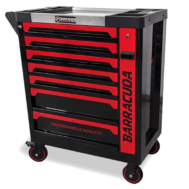 La servante d’atelier XXL 8 tiroirs/6 outillés Barracuda permet aux mécaniciens de transporter facilement les outils.